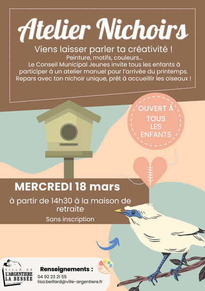 Dans le cadre de son initiative intergénérationnelle, les enfants du Conseil Municipal Jeunes et les élues membres de la commission scolaire et jeunesse, organisent un atelier de fabrication de nichoirs en collaboration avec les résidents de la maison de retraite Villa Montbrison. Cet atelier réunira résidents et jeunes afin de partager un moment créatif et convivial autour de la nature, pour l'arrivée du printemps.