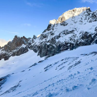Siamo a Vallouise da quattro mesi, quindi era impensabile partire senza aver avuto a che fare con le vette più mitiche della valle, con gli sci o a piedi. Il massiccio degli Écrins è ricco di gare superbe, cime ambite e belle creste affilate. Dopo Roche Faurio, il Dôme des Écrins e l’attraversamento del Dômes de Monêtier per la giornata, si parte per attaccare il Mont Pelvoux, culminato a 3943 m sul livello del mare.