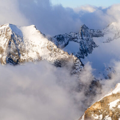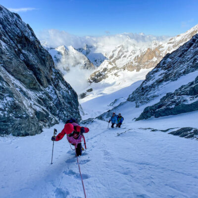 Ad ogni modo, nonostante la salita sul canale richieda un’attenzione particolare e un buon rampone, non ho potuto fare a meno di ammirare l’alba che si stava dispiegando alle mie spalle. Quella mattina, le tonalità rosa e arancioni rivelavano l’imponenza e la verticalità di queste pareti rocciose, ancora in gran parte ricoperte di neve, accentuando per contrasto, la leggerezza e la finezza della nebbia e delle nuvole.