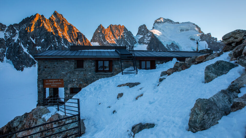 Dopo una ripida salita (+600 m) dal Ghiacciaio Bianco, arroccato sul suo sperone roccioso, il rifugio Écrins offre un panorama mozzafiato di fronte alla Barre des Écrins (4.115 m). Questo rifugio in pietra è un luogo ricco di emozioni: prima quota, tramonto grandioso e viva l’atmosfera di alta montagna.