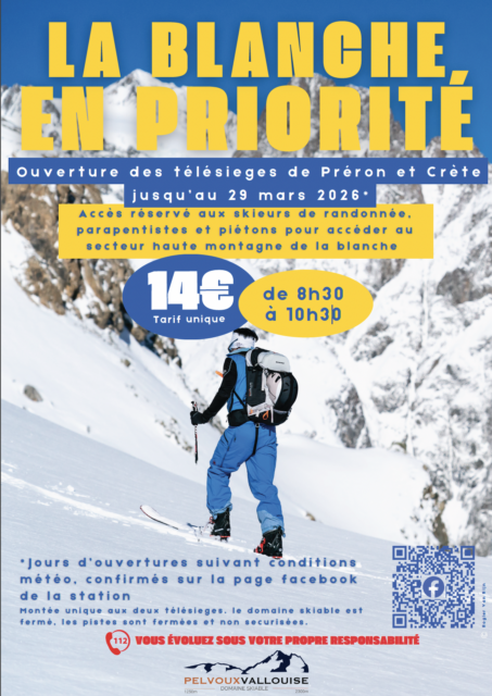 La station Pelvoux-Vallouise ferme son domaine skiable lelundi 23 mars 2026 mais les remontées restent accessibles jusqu’au 29 mars 2026 de 8h30 à 10h30. Le forfait est à 14€ et vous permet d’accéder au sommet du domaine pour enfiler vos peaux de phoques et partir à l’aventure (en direction de La Blanche par exemple). L’accès est réservé aux skieurs de randonnée et parapentistes, le domaine skiable étant fermé, le secteur est non sécurisé, vous évoluez sous votre propre responsabilité.