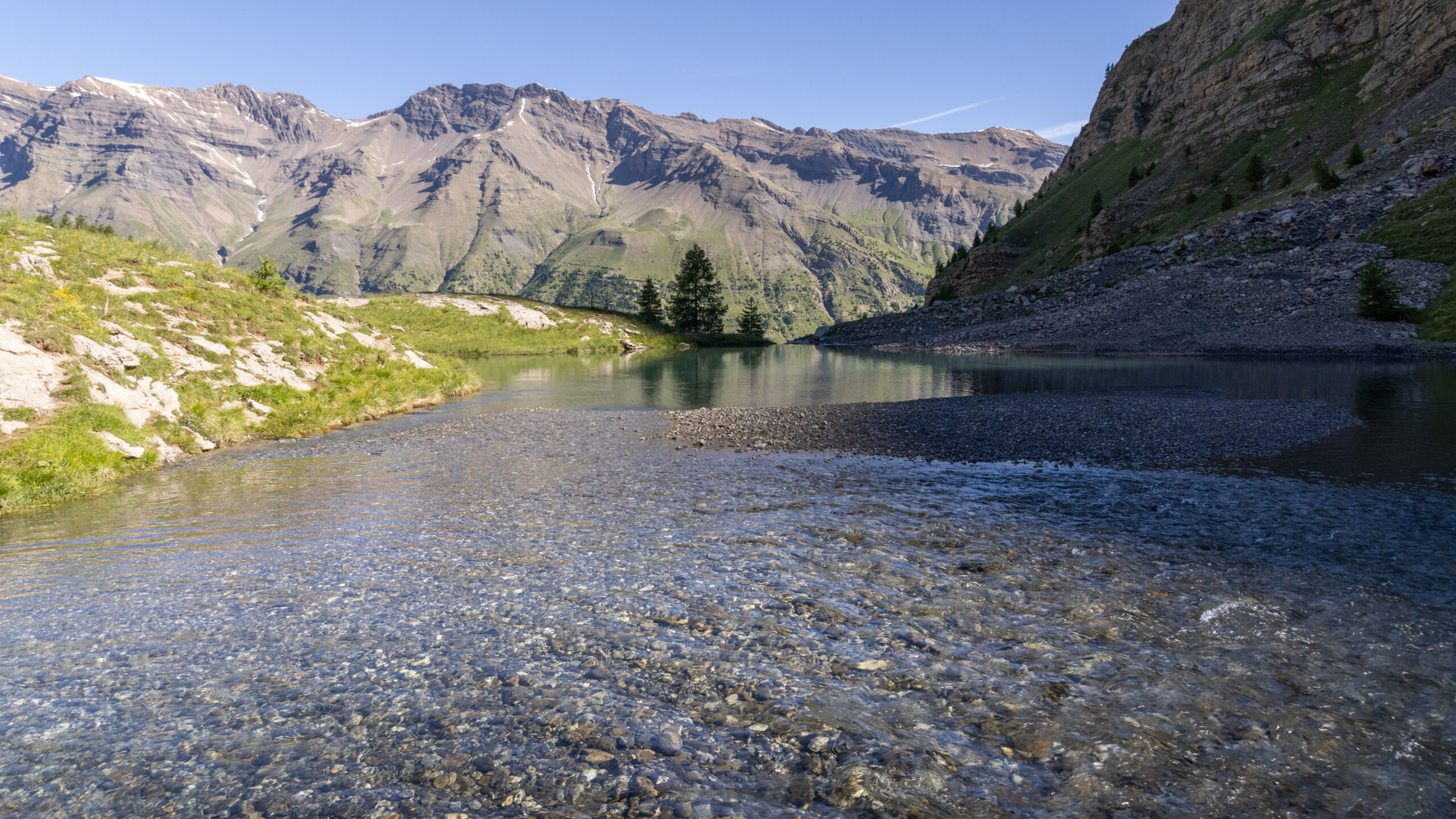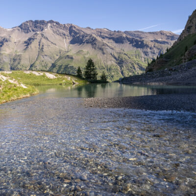 Het is op een hoogte van 1990 m, in het hart van het Nationaal Park Écrins , dat uw avontuur begint, met het meer van Fangeas voor een korte verfrissende pauze voordat u het meer van Faravel bereikt, een ideaal uitzichtpunt voor zonsopgangen.